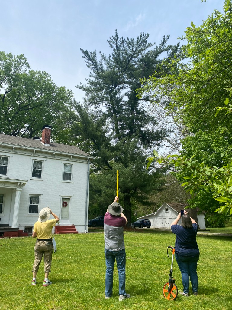 Owning the Markle House has given us opportunities like these to meet some really great people in the community. MaryBeth and Laura, (along with another lady whose name I’m afraid is escaping me) measured the Elm and Chestnut last year. They returned recently, bringing Steve with them this time, to measure two more of our trees – a White Pine and a Sycamore. These trees will be included in the Markle House stop of the Big Tree Bus Tour on June 11.