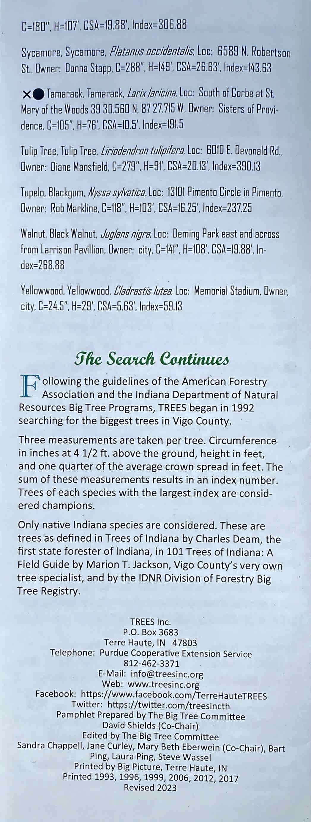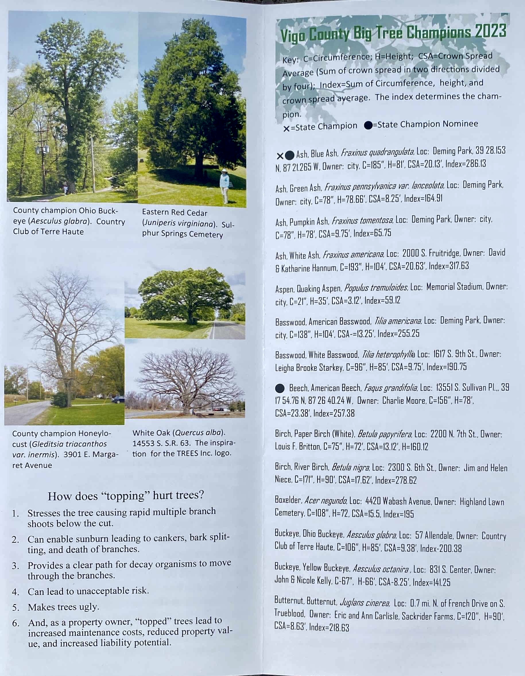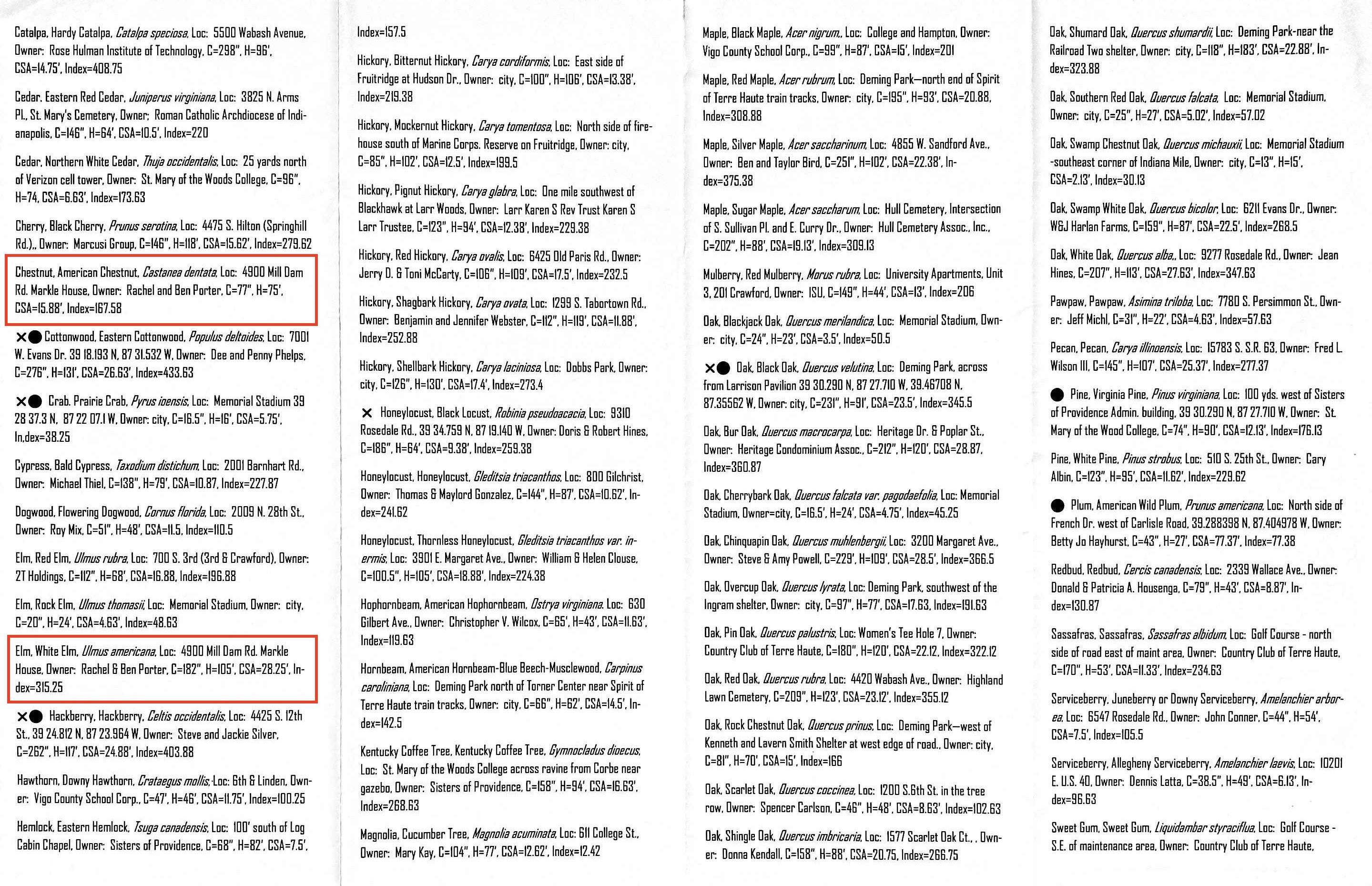 We are thrilled to have two Markle House trees featured in this year’s Big Tree Registry from Trees, Inc! Our American Chestnut and White Elm trees are highlighted with red boxes in the pictures of their brochure below (click to enlarge.)