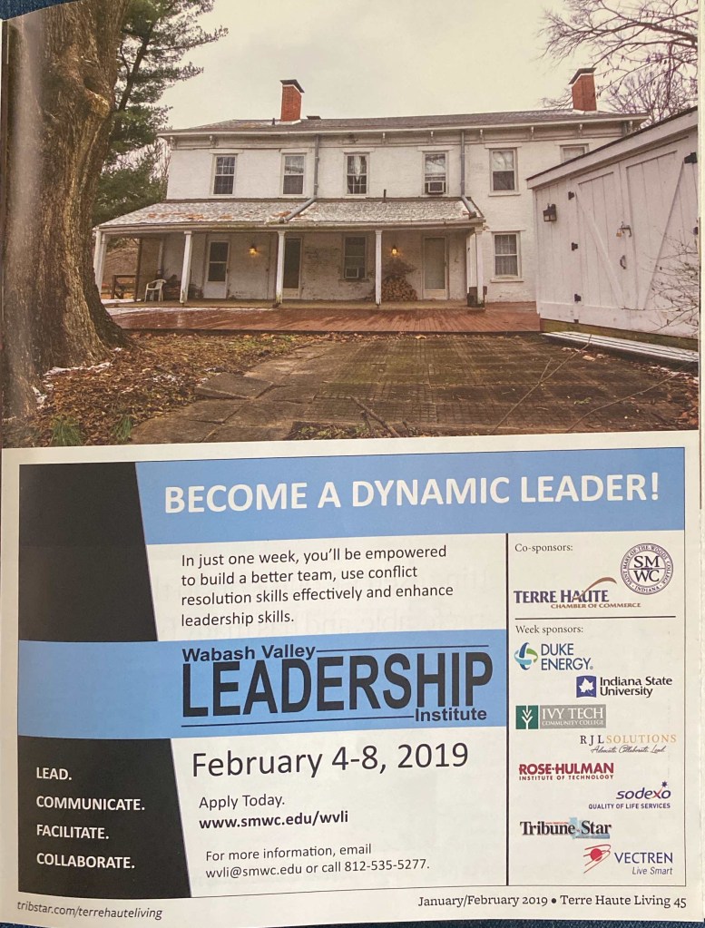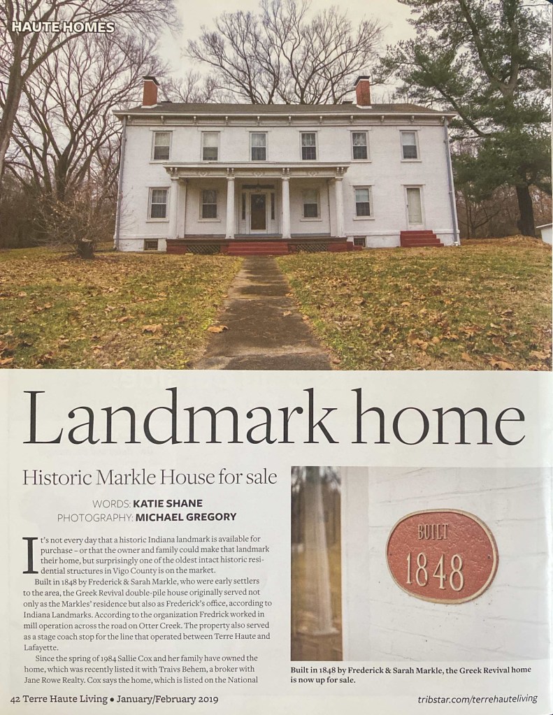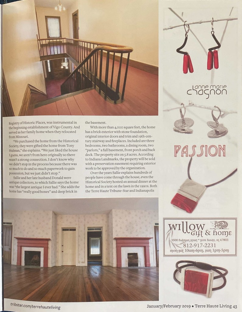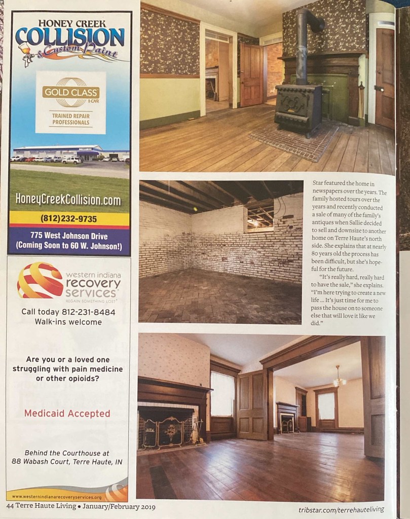 When we first looked into purchasing the home I reached out to the owner, Sallie Cox. I had questions, but I really just wanted to meet this woman who had purchased the home in the 80’s with her husband and worked to preserve it for years – just as Ben and I were considering. We had a long and fascinating conversation. At the conclusion, she offered to send me a copy of the Jan/Feb 2019 edition of Terre Haute Living Magazine.